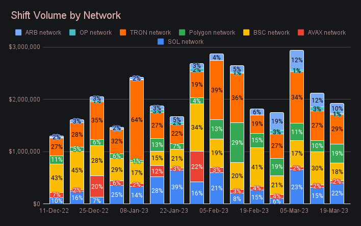 A quick look at our networks shows a mixed bag - half had week on week volume increases while half decreased. The front-runners of BSC and OP had a sharp drop off in shift activity, falling respectively by 47% and 80%. Instead, Polygon increased 68.5% to net $337k, while SOL similarly rose 27% to total $414k. These were enough to rank a respective 2nd and 3rd, when excluding the Ethereum network. Claiming first place among networks was TRON, hardly wavering from its benchmark last week, and changing just 0.4% for $564k.