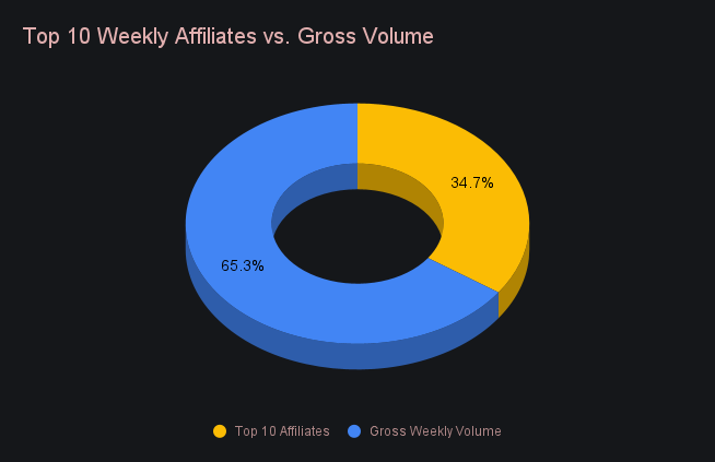 The top 10 affiliates combined for a very respectable $3.23m, 42.2% higher than last week’s total. This came following a >50% increase which took place last week, thereby speaking volumes to the growth top affiliates have had in the past month. Shift count for the top 10 grew 19.8% and totalled 2,394. Our top affiliate had a big impact on this growth in both volume and count. It alone represented 20.4% of weekly volume and 19% of weekly count, more than double that of the next nearest affiliate.