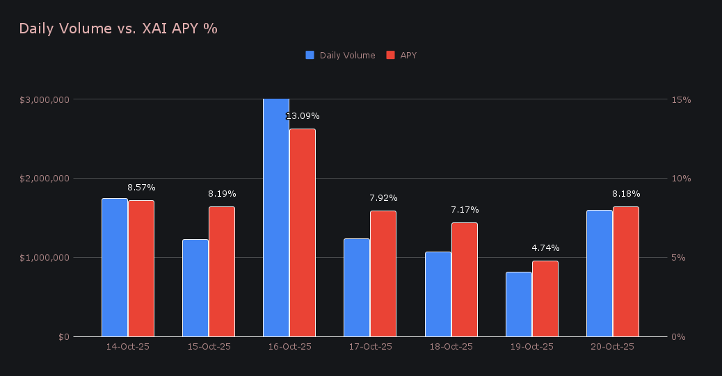 Staking activity mirrored the slower pace of overall volume but remained decent, supported by brief bursts of engagement midweek. A total of 212,023.29 XAI ($29,534.89) was distributed directly to our staking vault at an average APY of 8.27%, maintaining stable yields. The most active day came on October 16, when 47,048.89 XAI was deposited to the vault at a 13.09% APY, backed by $3.04m in daily shifting volume. Despite lower market activity, staking yields held steady and continued to reward stakers.