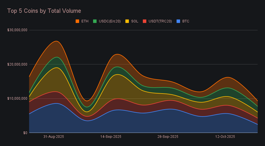 Rounding out the top five coins, SOL and ETH finished in third and fifth place, respectively. SOL recorded $1.77m (−31.0%) in total volume, with $557k (−54.4%) in deposits and $984k (+20.2%) in settlements — making it the only top coin to see an increase in activity on either side of the shift. That rise in settlements stood out during an otherwise bleak stretch. SOL has held a modest lead between the two in four of the past six periods, reflecting steady user demand for Solana despite the recent fluctuations in overall volume. ETH followed with $1.59m (−48.8%), including $821k (−45.6%) in deposits and $636k (−33.6%) in settlements. Both coins have declined sharply since their early-September highs, but SOL’s recurring settlement strength has helped it maintain a slight advantage in SideShift activity heading into late October.