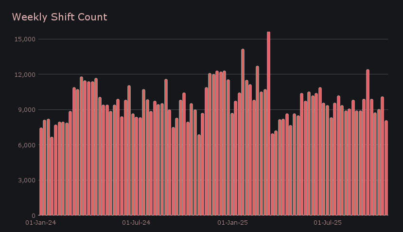 There was a clear lack of large-scale shifting, reflected in the relatively light totals of our top pairs. The leading user pair, L-BTC/WBTC (Polygon), reached $540k after a mid-week influx of larger shifts — the only standout among an otherwise subdued set of leaders. Other top pairs — USDT (ERC-20)/USDC (ERC-20) at $290k, ETH/SOL at $212k, and ETH/BTC at $203k — all registered relatively lackluster totals, marking an uncharacteristic week with few BTC-based pairs near the top. Shift count finished at 8,052 (−20.1%), or roughly 1,150 per day, declining alongside volume as users transacted in smaller sizes throughout the past seven days.