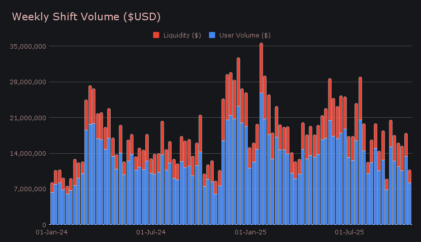 After last week’s volatile but active trading stretch, SideShift activity slowed notably alongside the weakened market sentiment. Gross weekly volume fell to $10.72m (−40.1%), with user shifting contributing $8.22m (−38.7%). Liquidity shifting added a further $2.49m (−44.2%), declining more than user volume as rebalancing needs tapered off in step with timid market conditions. Paired together with user volume, this produced an average daily volume of $1.53m.