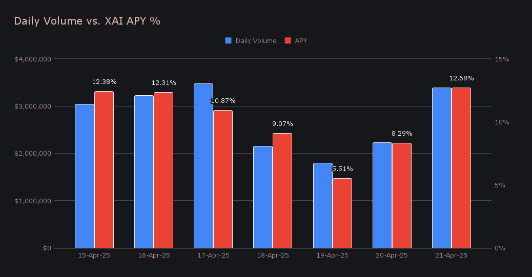 XAI stakers saw consistent returns throughout the week, with the highest daily APY peaking at 12.68% on April 22, when 43,288.97 XAI were distributed directly to our staking vault. This day also recorded the week’s highest daily volume at $3.38m. All together, XAI stakers received a total of 244,751.83 XAI or $32,513.81 USD in rewards throughout the week.