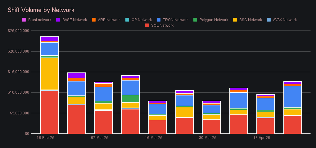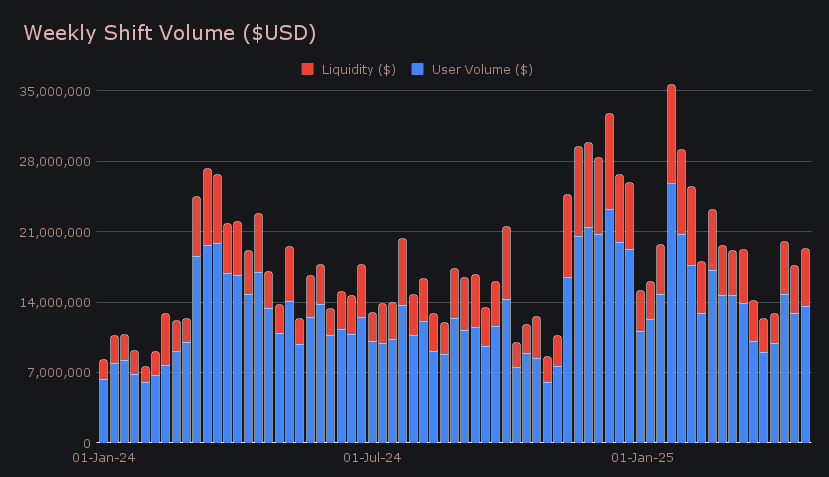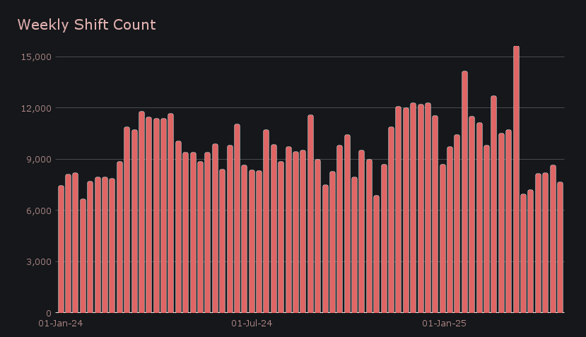 Conversely, our gross shift count dipped to 7,642 (-11.7%), marking the lowest weekly total so far this month and ending -25% below the YTD average. This decline contrasted the consistent volume and resulted in a notable rise in average shift size, which hit $2,520 - the highest of the past 11 weeks. Altogether, SideShift averaged $2.75m in daily volume across 1,092 shifts, pointing to fewer, but significantly larger, shifts throughout the period.