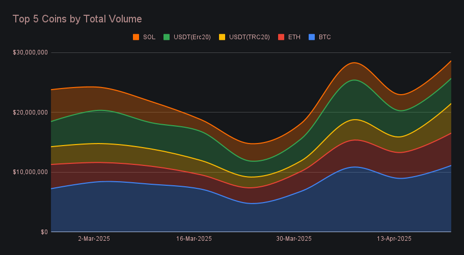 USDT (TRC20) climbed into third place with $4.9m (+87.8%), leapfrogging USDT (ERC20) for the first time this year. The increase came on the back of strong gains on both sides - user deposits rose to $1.4m (+58.8%), while settlements hit $1.7m (+57%). This total marked the second-highest weekly volume for USDT (TRC20) so far in 2025, reflecting a notable rise in stablecoin activity on the Tron network. SOL, meanwhile, appears to have found some stability following a steady decline in volume since January. This week, it finished in fifth with $3.0m (+9.7%), delivering a balanced mix of deposit and settlement flows.