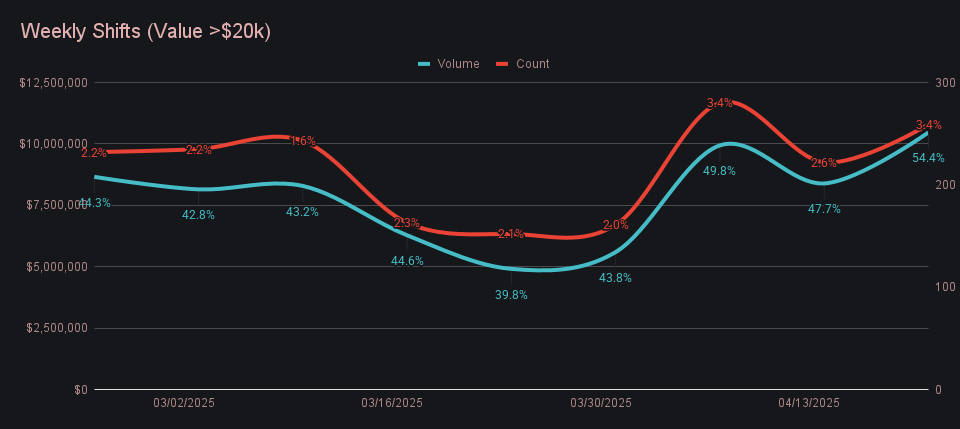 Whale activity gained traction this week, with a gross $10.5m shifted in transactions larger than $20k, the largest sum in recent months. These shifts accounted for 54.4% of our weekly volume, a new high for 2025 and a clear sign that big shifters are becoming increasingly active. The count of whale shifts also stood out, with 259 such shifts making up 3.4% of the total, matching the peak from just two weeks ago. Both of these metrics are now displaying a nice upward trend, after a notable lull in mid to late March.