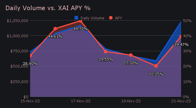 XAI stakers were rewarded with a very healthy average APY of 33.96% over the previous week. SideShift saw solid volume and shift count, with a daily rewards high of 43,348.88 XAI being deposited to our staking vault on November 18th, 2022. This amounted to 49.72%, and followed a net daily volume of $1.17m.