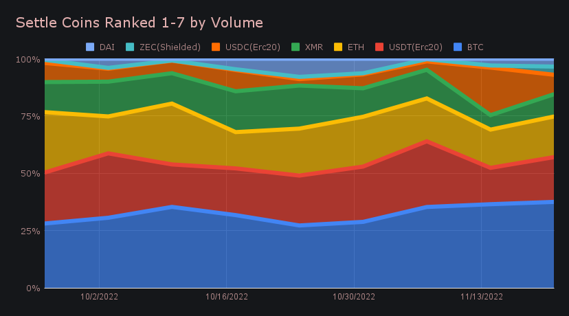 On the settle side, BTC was our most demanded coin with $2.01m, down 37% from last week’s sum of $3.19m. This was followed by USDT (ERC-20) with $1.05m (-24.5%), and ETH with $949k (-34.9%). Notable in 6th place was Zcash (shielded), which saw settlements rise by 136.9% to net $192k. This was largely due to a sizable one time influx of user(s) shifting from MATIC towards the end of last week.