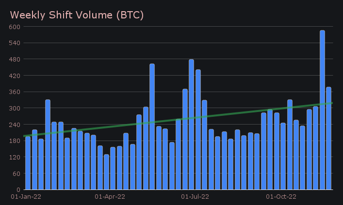 In the wake of a standout week, shift action on SideShift slowed slightly, but ultimately performed quite well as the month of November moved along. We finished the period with a net weekly volume of $6.19m (-37.2% from last week) on 6,600 shifts (-8.0%). This produced daily averages of $885k on 943 shifts. Keep in mind that although these are drastic percentage changes, they are all measured against a crazy anomaly which unfolded last week. When denoted in BTC, these numbers translate to a weekly volume total of 376.21 BTC - a large drop from last week’s spike, but ultimately still form a trendline which is firmly tilted upwards.