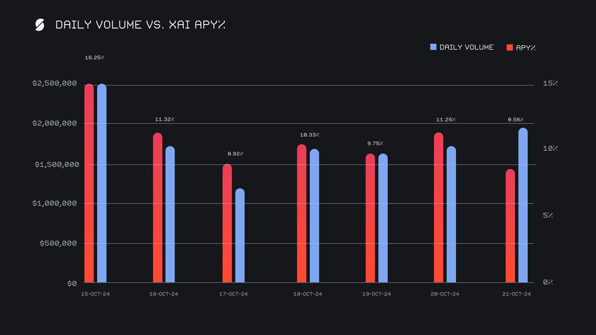 XAI stakers were rewarded with an average APY of 10.92% throughout the week, with a daily rewards high of 51,745.8 XAI (an APY of 16.15%) being distributed directly to the staking vault on October 16, 2024, following a daily volume of $2.7m. This week, XAI stakers received a total of 248,945.23 XAI or $30,819.42 USD in staking rewards.