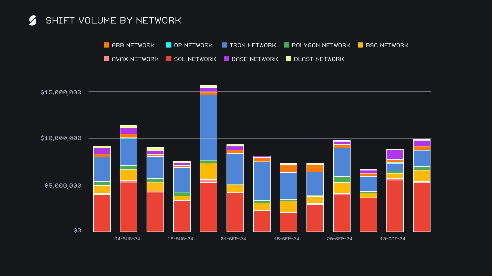 SideShift recorded a gross weekly volume of $12.5m, marking an increase of +7% from the previous period, and also representing total volume growth for the third consecutive week. User volume carried on rather steadily and summed $8.5m, a decline of -5%. Conversely, liquidity shifting took a jump and increased to $4m, which was required to even out the one way shifting of many coins. This was demonstrated most clearly by the ongoing demand for SOL, which has continued to rise steadily throughout the month. The ETH/SOL pair finished as the most shifted pair among users for the third week in a row, this week ending just shy of $1m.