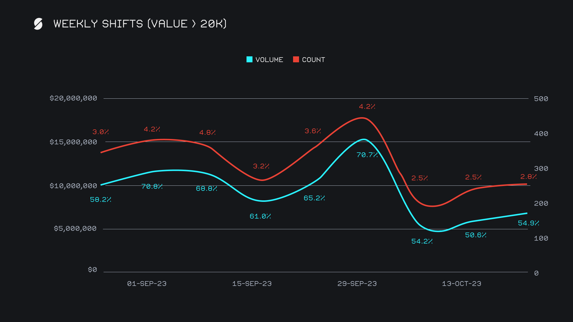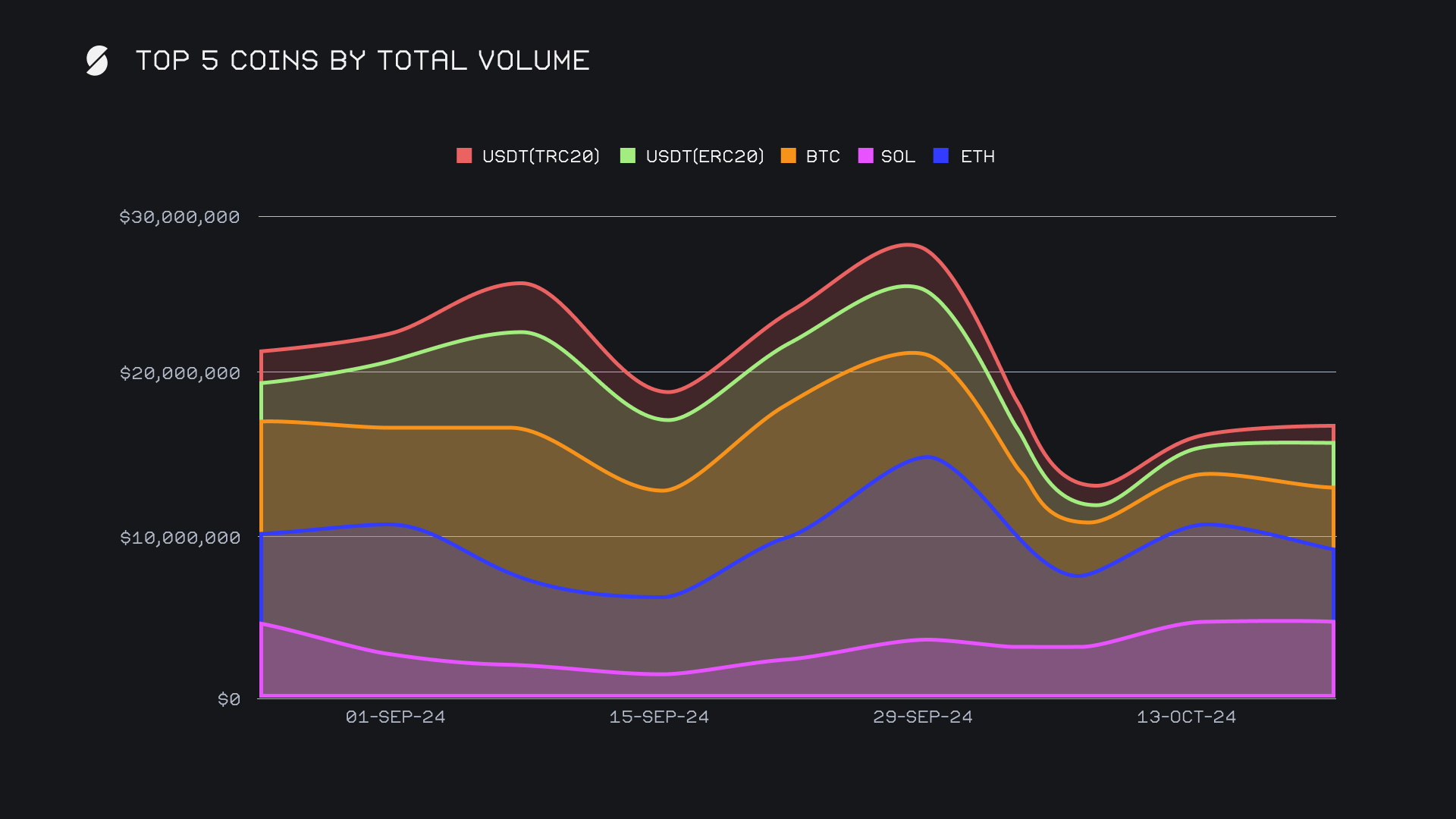 Growth among stablecoins played a key role in maintaining SideShift's total volume this week, particularly as large-scale shifts have been notably absent as of late. The below chart outlines how the lack of whale activity (shifts over $10k) has impacted our overall volume - the lines represent the nominal weekly sums, while the percentages represent the whale shifts proportion of our weekly total volume. Following the sharp decline seen at the beginning of October, the recent gradual recovery was supported by strong stablecoin performances, most of which involved generally larger shift sizes on average. This week saw USDT (ERC20) volume increase to $2.9m (+61.1%), USDT (TRC20) rise to $1.2m (+68.5%), and USDT (BSC) surge to $998k (+174.6%). These ranked in positions 4 through 6 overall, and helped to fill the gap left by top coins such as BTC and ETH, which are seeing less action than normal.