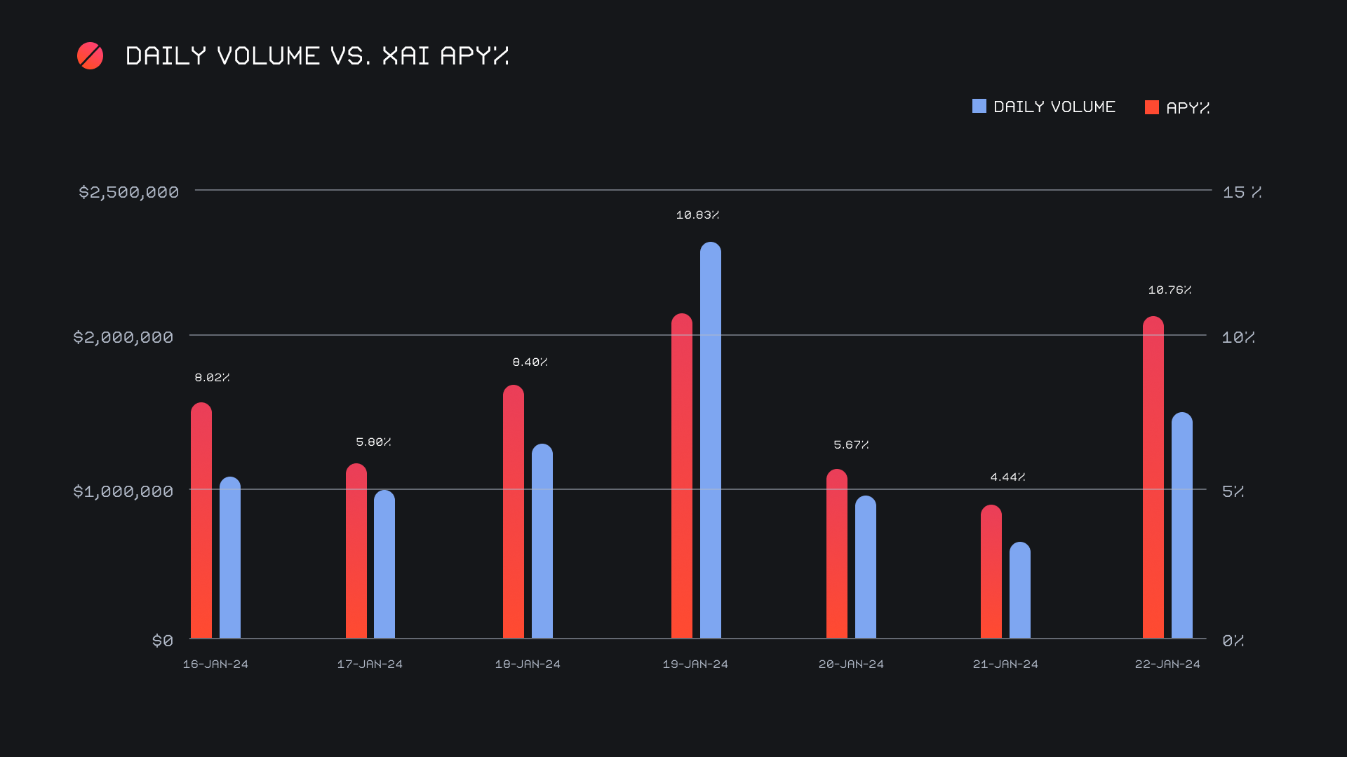 XAI stakers were rewarded with an average APY of 7.7% this week, with a daily rewards high of 32,542.12 XAI being distributed to our staking vault on January 20th, 2024. This was following a daily volume of $2.7m. This week XAI stakers received a total of 163,848.68 XAI, or 20,841.55 USD.