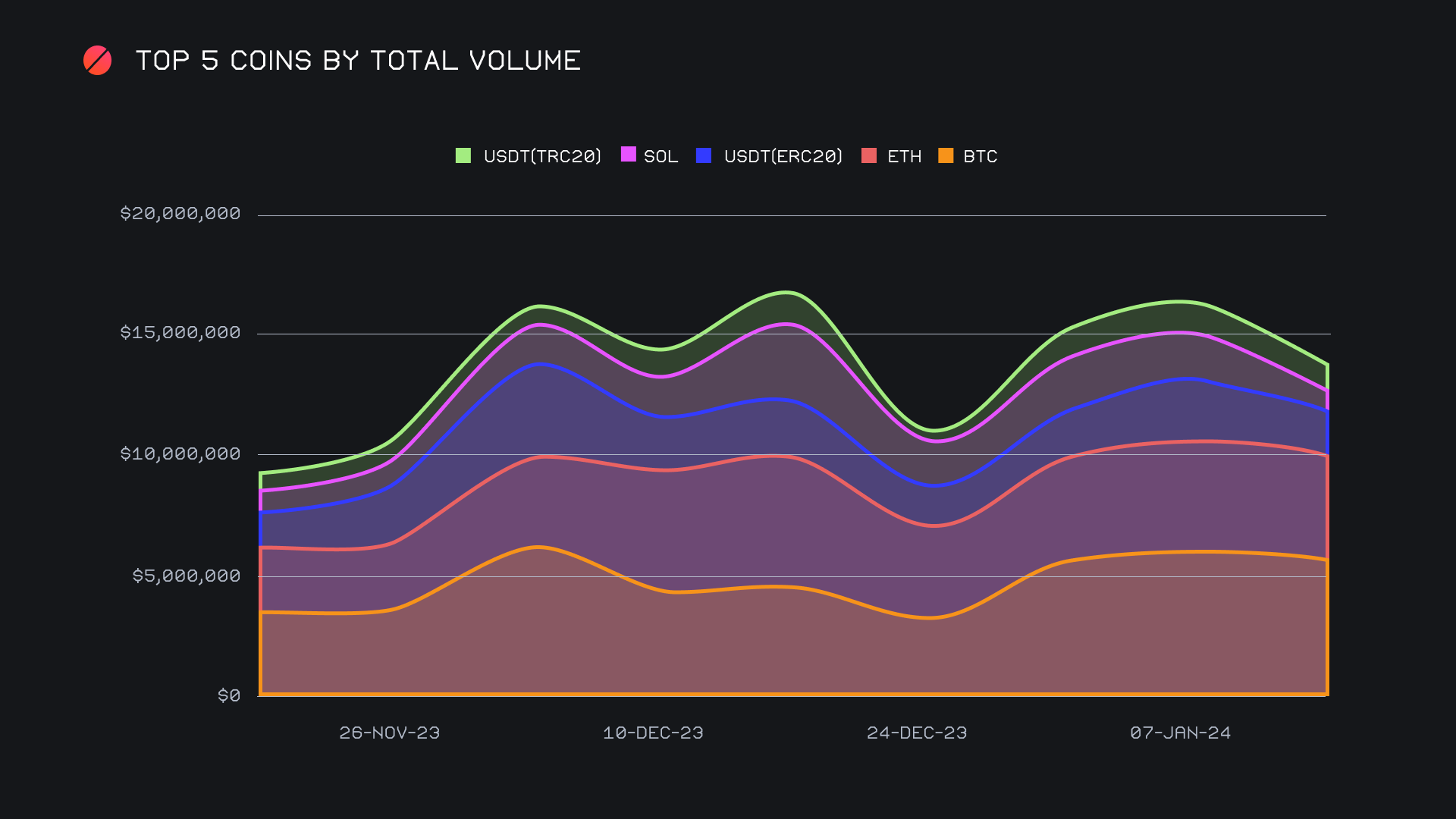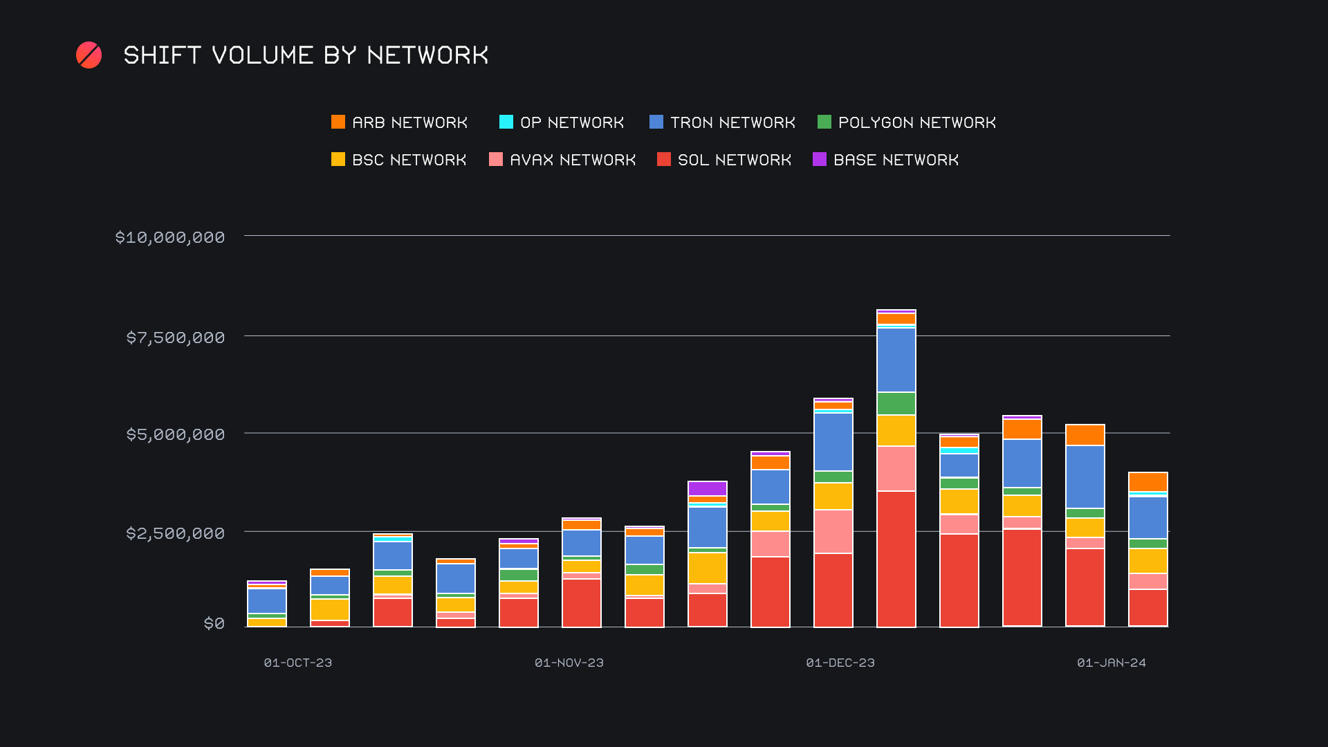 When zooming out slightly, we can note the clear ebb and flow of the entire Solana network on SideShift throughout the past few months. A combined $1.11m (-48.1%) saw the Solana network fall to second place this week, with the Tron network just barely claiming first place with $1.13m (-28.9%). Following in third came the Binance Smart Chain (BSC) network, with $641k (+32%), primarily due to a +75% increase in user BNB settlements. Despite the dwindling behavior of these alternate networks in recent weeks, we can gain some perspective from this zoomed out approach. From here, it’s clear just how quickly these networks can pick up steam, as outlined below with the comparison of October 2023 to December 2023, more than a 6x increase in a matter of just 10 or so weeks.