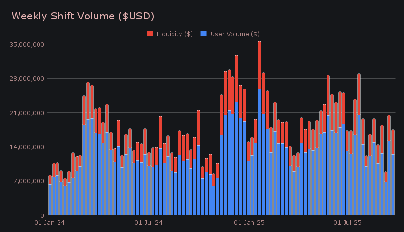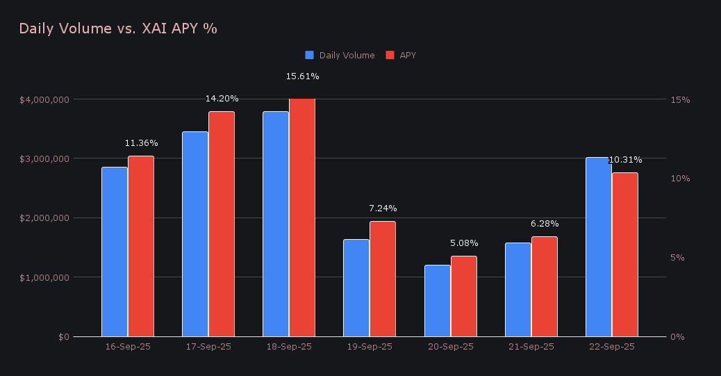 Staking totals moved slightly higher, with 252,197.13 XAI (worth $42,000.84) being distributed to the staking vault at an average yield of 10.01% APY. September 18th was the most notable day, with 55,085.99 XAI rewarded at an APY of 15.61%, supported by $3.79m in daily shift volume. Both rewards and yields finished above last week’s levels, reflecting a steady uptick alongside ongoing platform activity.