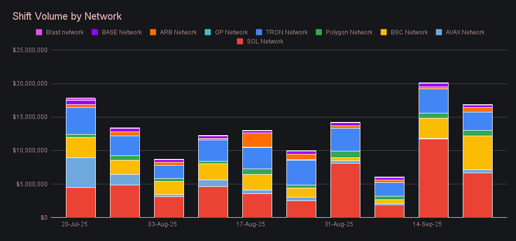 SideShift volume cooled to $17.48m (−14.7%) following last week’s rebound, with user activity summing $12.52m (−18.1%) and internal liquidity rebalancing adding a further $4.96m (−4.3%) in shift volume. The smaller pullback in rebalancing pointed to a more even balance between supply and demand of top coins, which required fewer internal moves along with the overall reduced volume. The week’s leaders also told a story — our top two pairs, USDT (BSC)/BTC at $1.20m and USDC (SOL)/SOL at $736k, were both stablecoin inflows, and less common ones at that, highlighting heavy buying interest from multiple chains. This contrasted with recent months, when flows more often leaned toward selling into stables. ETH/SOL rounded out the group at $429k, keeping BTC and SOL at the center of activity.