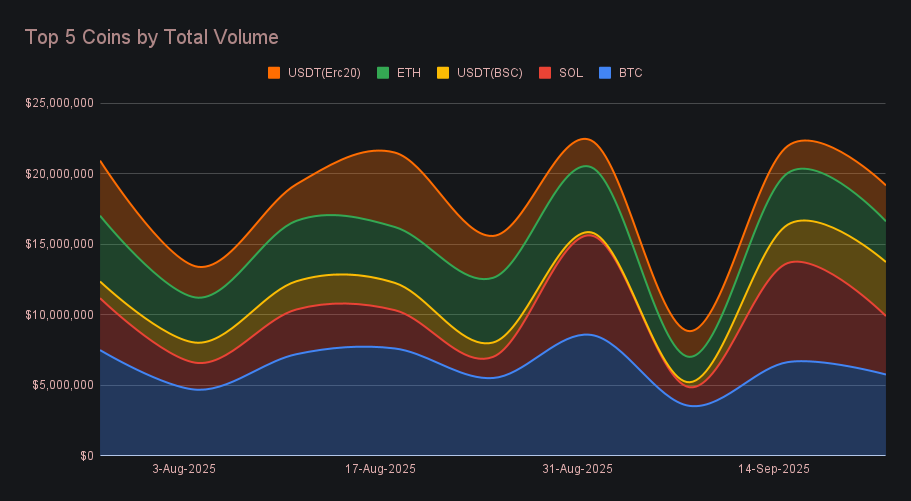 Stablecoins rounded out the top five, with USDT (BSC) breaking into the leaderboard for the first time in 2025 and even finishing third at $3.83m (+40.7%). Its climb was heavily aided by the week’s leading pair, echoing the way SOL volume was lifted by SOL/USDC (SOL) a week earlier. User deposits reached $1.63m (+28.7%) while settlements totaled $746k (+54.8%), confirming broad engagement on both sides. USDT (ERC-20) also advanced to $2.55m (+32.7%), marking its return to the top five after a string of comparatively slower weeks, consisting of $724k in deposits (+62.2%) and $1.21m in settlements (+25.4%).