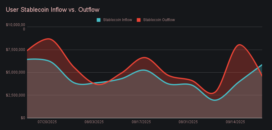 For stablecoins as a whole, the bigger story was the shift in user flows. Net stablecoin activity ended the week at +$1.28m, a swing of more than $5.3m compared to last week’s heavy outflows. It marked the sixth positive flash this year and the largest to date, signaling a clear uptick in user risk appetite, and was driven by heavy deposits into both USDT (BSC) and USDC (SOL). A positive stablecoin flow has yet to sustain in back-to-back weeks in 2025, leaving this as a key trend to watch as we move forward.