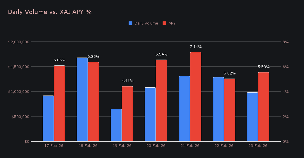 Staking rewards came in lighter again, following the strength seen during the first half of the month. A total of 154,794.76 XAI was distributed directly to the staking vault, worth $16,737, with the average APY landing at 5.86%. Two weeks ago, that figure was closer to 19%, so the slowdown over the past few updates has been clear. Payouts continued to track platform activity closely — volume opened at a decent clip before settling into a steadier rhythm, and yields followed that pattern without much deviation. The busiest day fell on February 21st, when 26,785.60 XAI was sent to the staking vault at a 7.14% APY, backed by $1.31m in daily volume.
