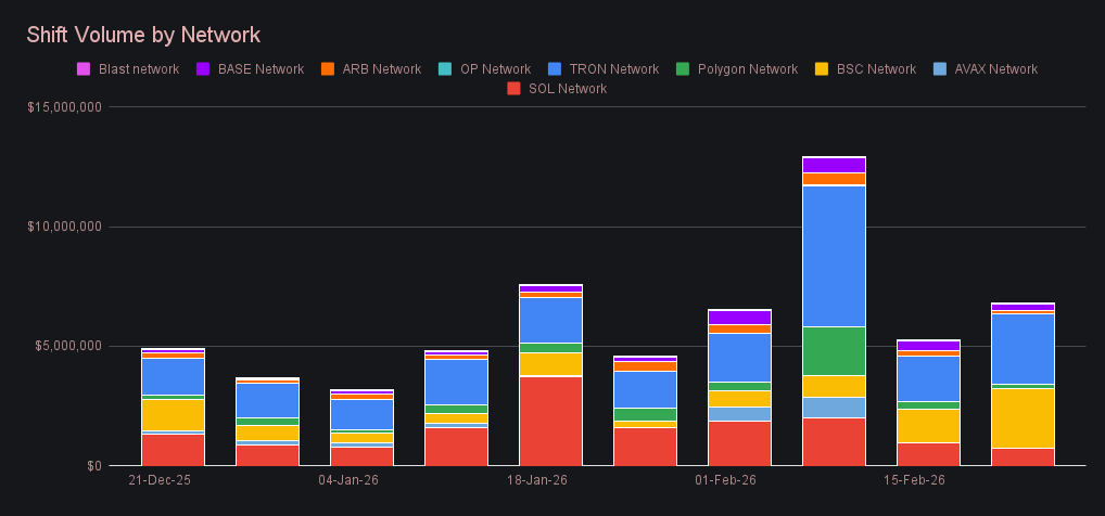 SideShift recorded $7.88m in gross volume, a −13.8% decline from the prior report. The pullback was driven primarily by slower user activity, with user shifting totaling $5.35m (−20.5%), while liquidity shifting rose to $2.53m (+4.7%). The divergence suggests that a large portion of shifts were uneven and concentrated, which increased the need for internal rebalancing. Top user pairs reflected this trend. USDT (BSC)/USDT (TRC-20) led at $718k, followed by BTC/PAXG at $683k, and USDT (BSC)/BTC at $264k, activity that was largely integration-driven and skewed in one direction.
