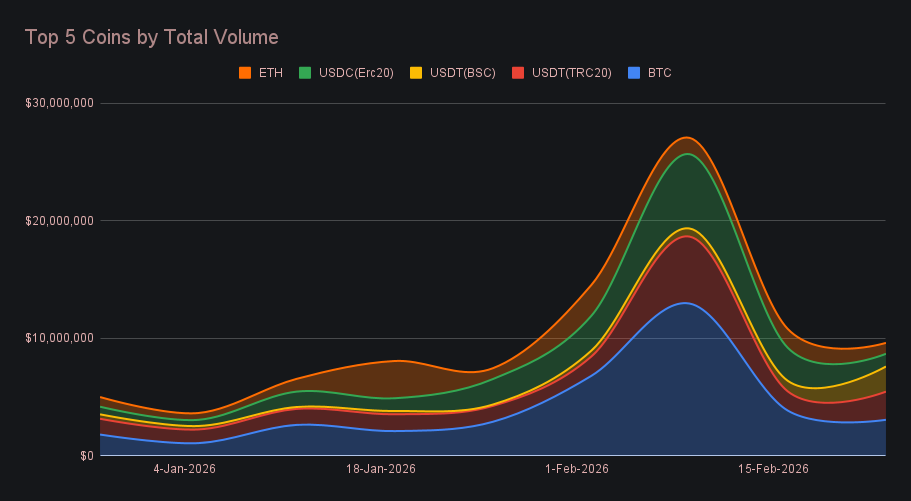 Stablecoins promptly filled the next three positions, but the reshuffle was concentrated outside the Ethereum network. USDT (TRC-20) climbed to second at $2.40m (+46.5%), while USDT (BSC) surged to $2.14m (+138.1%), both leapfrogging Ethereum-based counterparts and aligning with the week’s leading coin pair. The move in USDT (BSC) was particularly striking — volume expanded more than tenfold relative to its early-year baseline, driven largely by deposits ($1.08m, +267.9%), a pattern consistent with the coin's tendency to move in sudden and intense bursts rather than gradual build-ups. In contrast, USDC (ERC-20) retraced to $1.08m (−61.6%), and USDT (ERC-20) slipped below $1m for the first time this month, falling to sixth place. The shift away from Ethereum-based stablecoins was decisive, reinforcing how activity became increasingly concentrated on alternative networks as markets weakened.