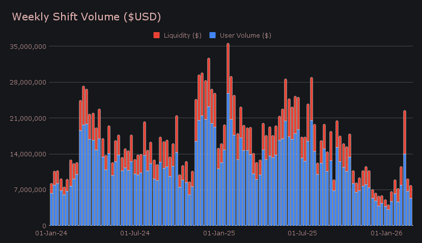 - Gross volume ended at $7.88m (−13.8%) across 7,161 shifts (−2.7%), despite volume from shifts >$20k rising to $4.23m (+3.4%).
