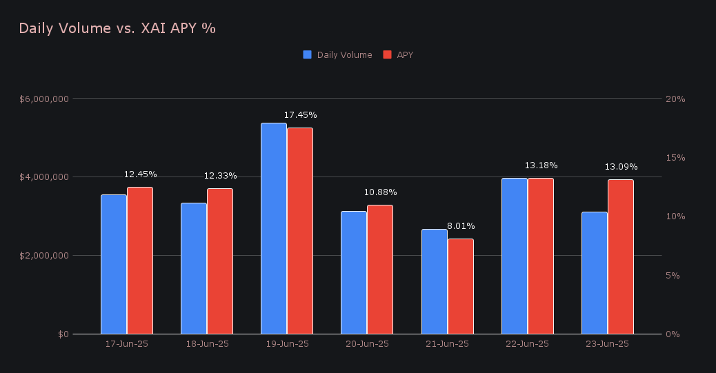 Despite the weekly decline in price, XAI staking continued to deliver reliable returns. The average APY this week was 12.48%, marking another solid stretch for stakers. This week’s highest daily payout occurred on June 20th, when 59,791.86 XAI was distributed to our staking vault at a 17.45% APY, corresponding with $5.36m in daily volume - the highest single-day volume recorded so far in June.