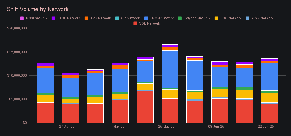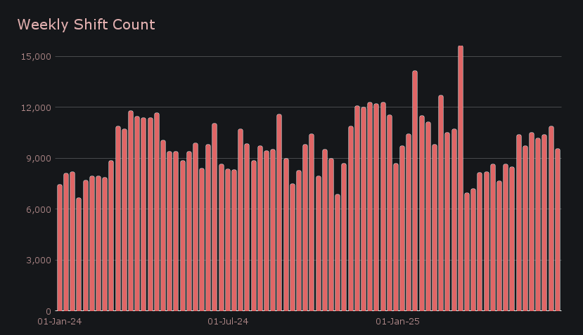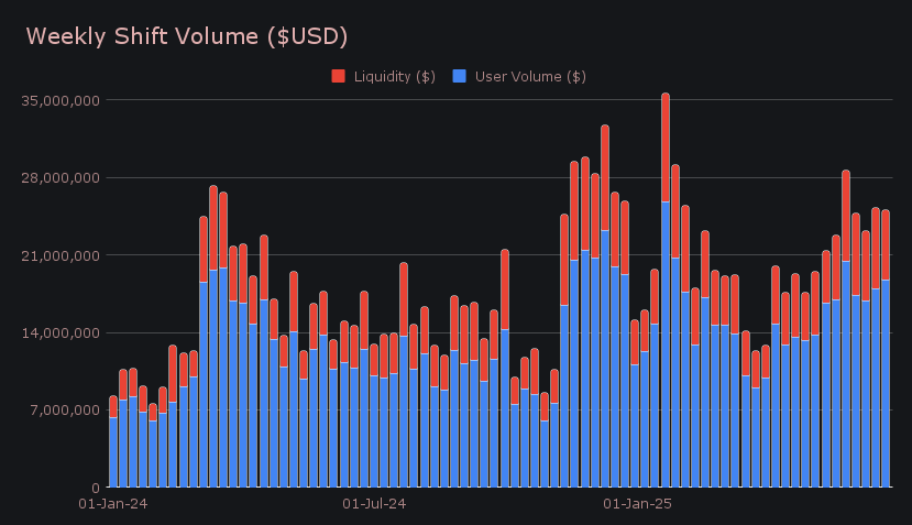 - SideShift processed $25.0m across 9,577 shifts, with higher avg. volume per shift offsetting a -12.1% dip in count.