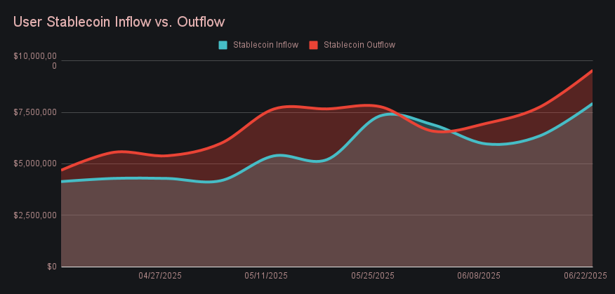 USDT (TRC-20) followed with a comparatively smaller total of $5.55m, but posted the most dramatic percentage gains among stablecoins. Deposits surged +46.2% to $1.91m, while settlements jumped +36.1% to $1.65m, indicating strong user-driven growth. Liquidity shifting activity also rose alongside this, contributing to the coin’s overall volume increase of +44.7%. Together, these sums placed USDT (TRC-20) within reach of its peak levels seen in late May. Meanwhile, USDC (ERC-20) was less prominent but still relevant, with an overall increase of +2.6% to $4.30m, supported by growth in deposits ($637k, +42.8%) and more notably, settlements ($2.53m, +16.2%). The overall rise on both sides of the shift process has pushed stablecoin activity to its highest point in months, helping drive this week’s broader volume growth, but with user flow direction still favoring settlements.
