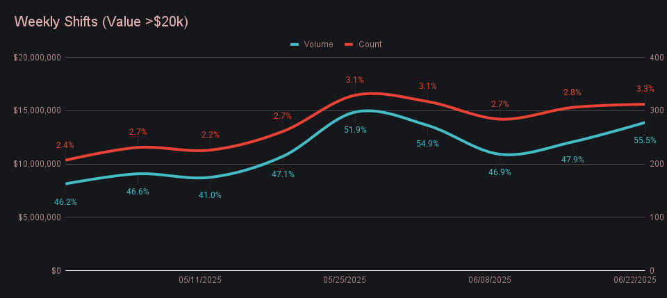 - Whale shifts ($20k+) surged to 312 and 55.5% of volume, one of the highest proportions this year.