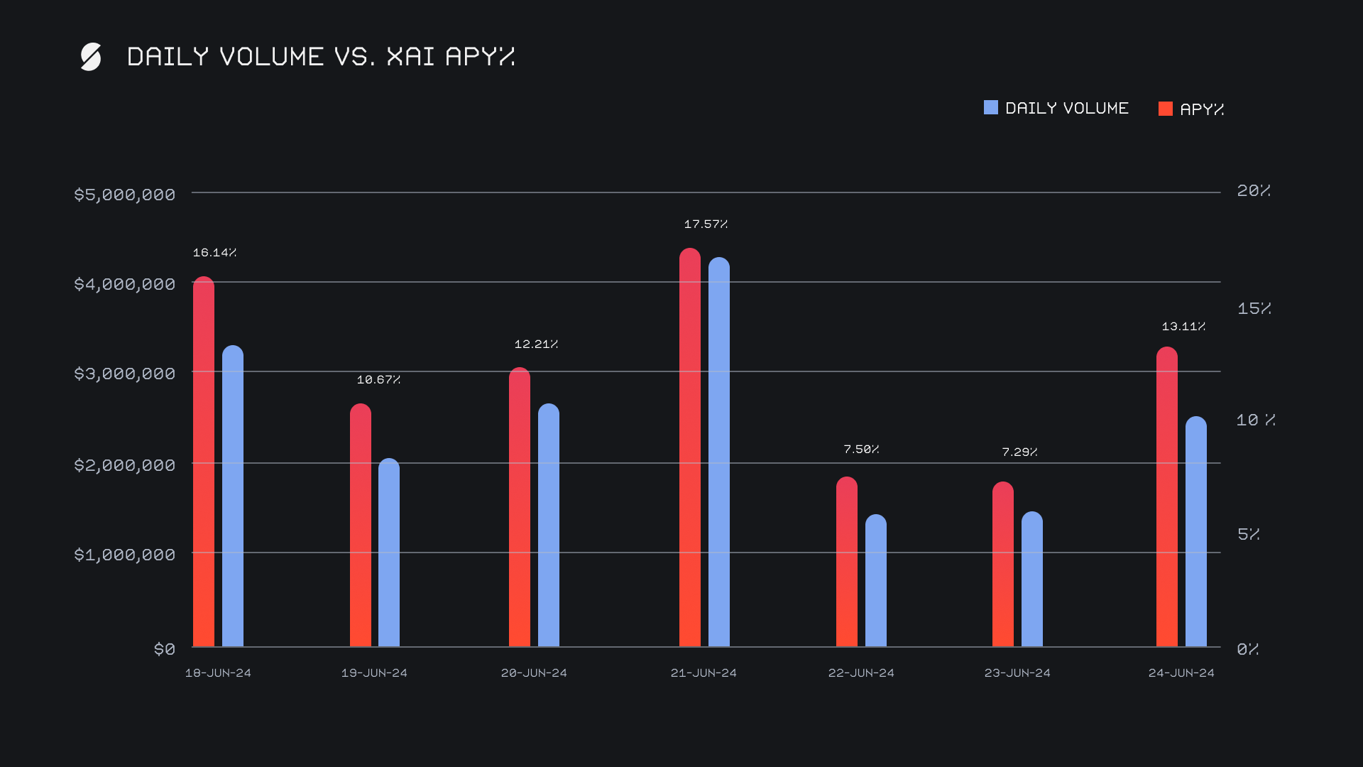 XAI stakers were rewarded with an average APY of 12.07% this week. The highest daily reward was distributed to our staking vault on June 22nd, 2024 and amounted to 53,813.04 XAI (equating to an APY of 17.57%), following a daily volume of $4.3m. This week, XAI stakers received a total of 263,934.66 XAI or $47,112.34 USD.