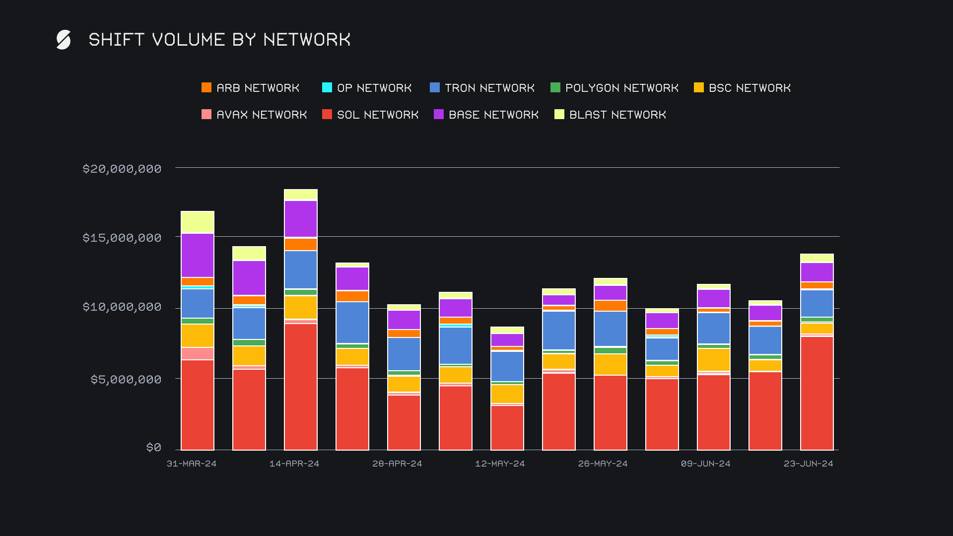With a rise of +45.7%, the Solana network’s $8.1m sum solidified its position as the leading alternate network to ETH. The native SOL token continues to account for the bulk of shifting, but stablecoins USDC(sol) and USDT(sol) do indeed see flashes of interest from users. The Base network also saw a considerable rise, reaching $1.4m (+23.4%), up from last week’s $1.2m finish. This positioned it third overall, one spot behind the Tron network, which tallied a steady $2.0m (-1.2%) due to its always consistent USDT (trc20) shifting. Among other networks, the Binance Smart Chain (BSC) network summed $876k for a modest +7.7% rise, while shifting on the Blast network tripled, growing to $599k (+202%). These alternate networks to ETH combined to account for 39.2% of weekly shift volume, a confident step ahead of the Ethereum network’s proportion of 31.5%.