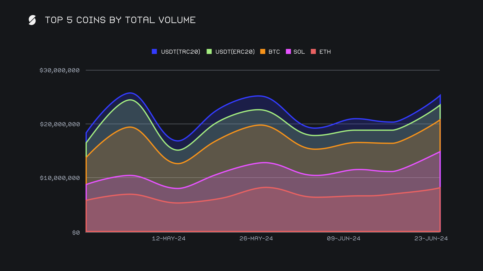 ETH retained its position as our top coin for an impressive fifth consecutive week, achieving a total weekly volume of $8.1m (+15.8%). The increase was driven by a substantial rise in deposit volume, which reached $3.0m (+40.3%), although its user settlement volume fell to $2.7m (-11.8%). This influx of ETH deposits also occurred alongside the ETH price trickling downwards, a representation of fear outweighing greed, although the end result was still high overall shift volume. In an additional statement of relative strength, this was the highest weekly total volume achieved by ETH throughout the past three months.