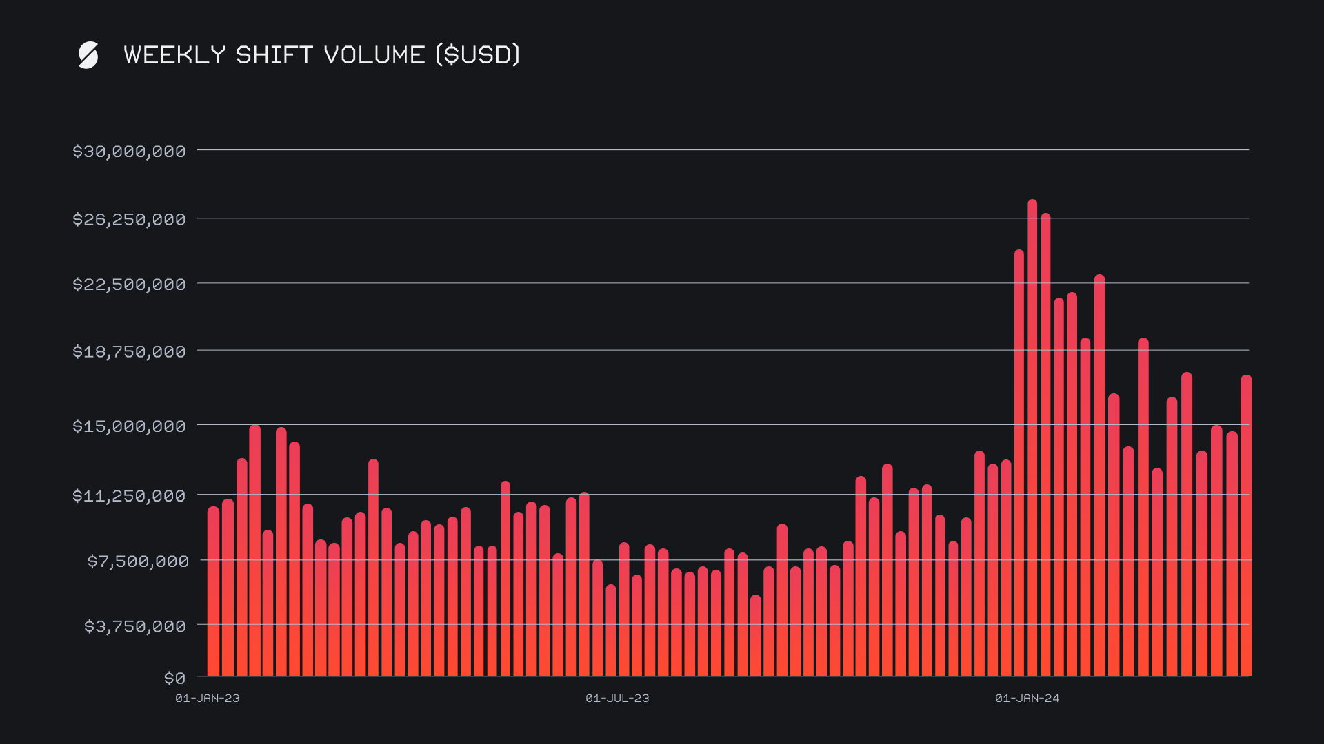 SideShift had a strong performance and rounded off the period with a healthy gross volume of $17.7m, marking a decent increase of +21.1% compared to last week. For some context on growth over time, this week’s volume ended more than double that of the weekly average seen throughout 2023 ($8.6m), something which is visualized and tracked in the chart below. Despite this solid outcome, it was interesting to note that our gross weekly shift count decreased by -21.6%, for a total of 8,650 shifts. This indicates a higher average shift value, which finished with daily averages of $2.5m on 1,236 shifts. A notable proportion of this came from our top shift pair coins, and derived from shifts taking place directly on the site.