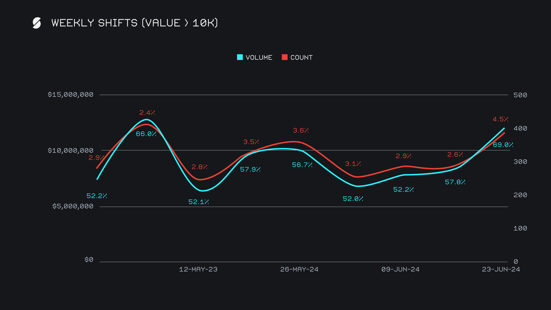 Whale shifting was evident this week, as embodied by our relatively high volume as compared to the lower overall shift count. Shifts with a value exceeding $10k accounted for an astounding 69% ($12.2m) of our weekly shift volume, not only ending as one of the highest proportions of the year, but among our highest ever - this is represented by the blue line below. The proportion of weekly count for this metric also hit a multi-month high at 4.5% (391 shifts), as shown by the red line. Particularly, whale shifting coincided with the week’s most popular shift pairs, with a substantial amount of these shifts stemming from ETH <> SOL.