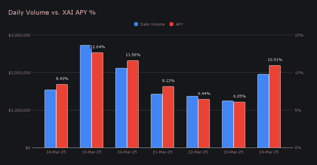 XAI stakers earned an average APY of 9.16% throughout the week. The highest daily rewards were distributed on March 20, 2025, when 42,778.91 XAI (APY of 12.64%) were deposited directly to our staking vault following a daily volume of $2.72m. XAI stakers received a total of 220,161.20 XAI or $31,108.55 in rewards throughout the week.