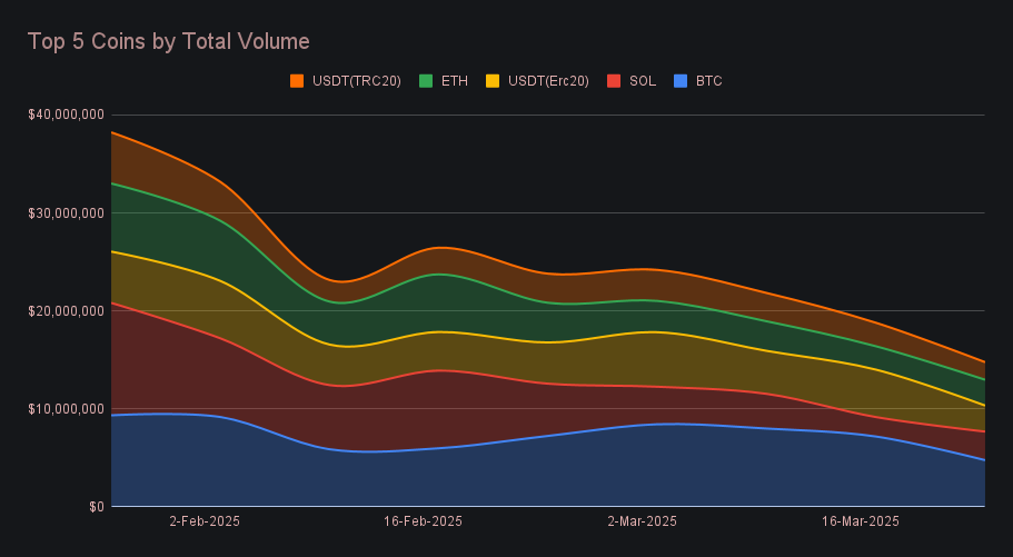 BTC held the top spot with $4.8m in total volume, though it was one of the few coins to record a decline, falling -33.6% week-on-week. Alongside stablecoins, BTC was among the biggest losers, reflecting a clear pivot away from risk-off assets. While user deposits climbed +24.3% to $2.2m, this was offset by a sharp -54.1% drop in settlements to $1.6m, suggesting users were shifting out of BTC rather than into it. The week’s top user pairs - BTC/USDT (ERC-20) and BTC/ETH - further highlighted this imbalance.