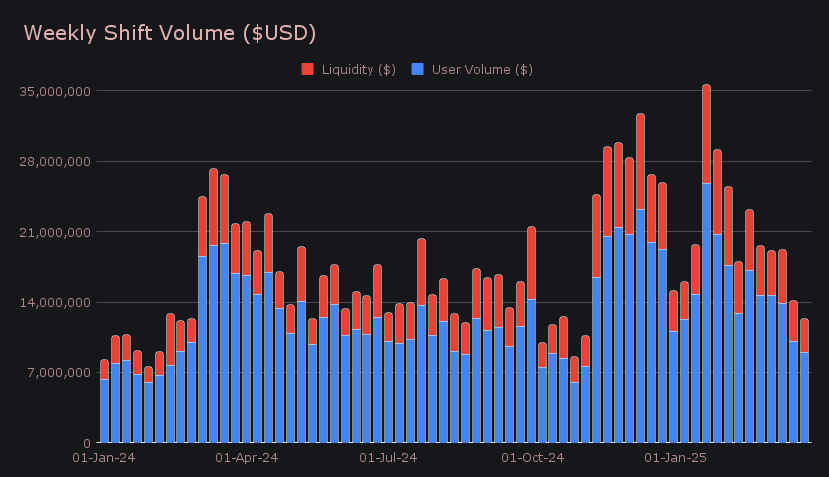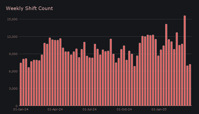 Shift activity saw a modest increase, with a total count of 7,198 shifts (+3.8%). However, this remains -36% below our running YTD average of ~10,800 shifts per week, and sits near levels that have only occurred a handful of times over the past year. Even so, volume remained comparatively stable, suggesting a consistent level of smaller-scale user activity.