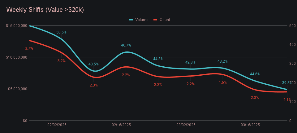 This week’s breakdown of high-value activity reflected some interesting movements across the upper tiers. The number of shifts valued above $10k rose +8.2% to 291, showing a slight uptick in mid-to-large sized transactions. Conversely, the top bracket of shifts over $20k saw a minor decline in count, falling -6.8% to a total of 152. Despite this, these larger whale-level swaps still accounted for a substantial portion of volume, combining for $4.91m. That figure, however, represented a significant -21.8% drop compared to the previous week, suggesting that while larger transactions remain present, their individual sizes may have slightly decreased.