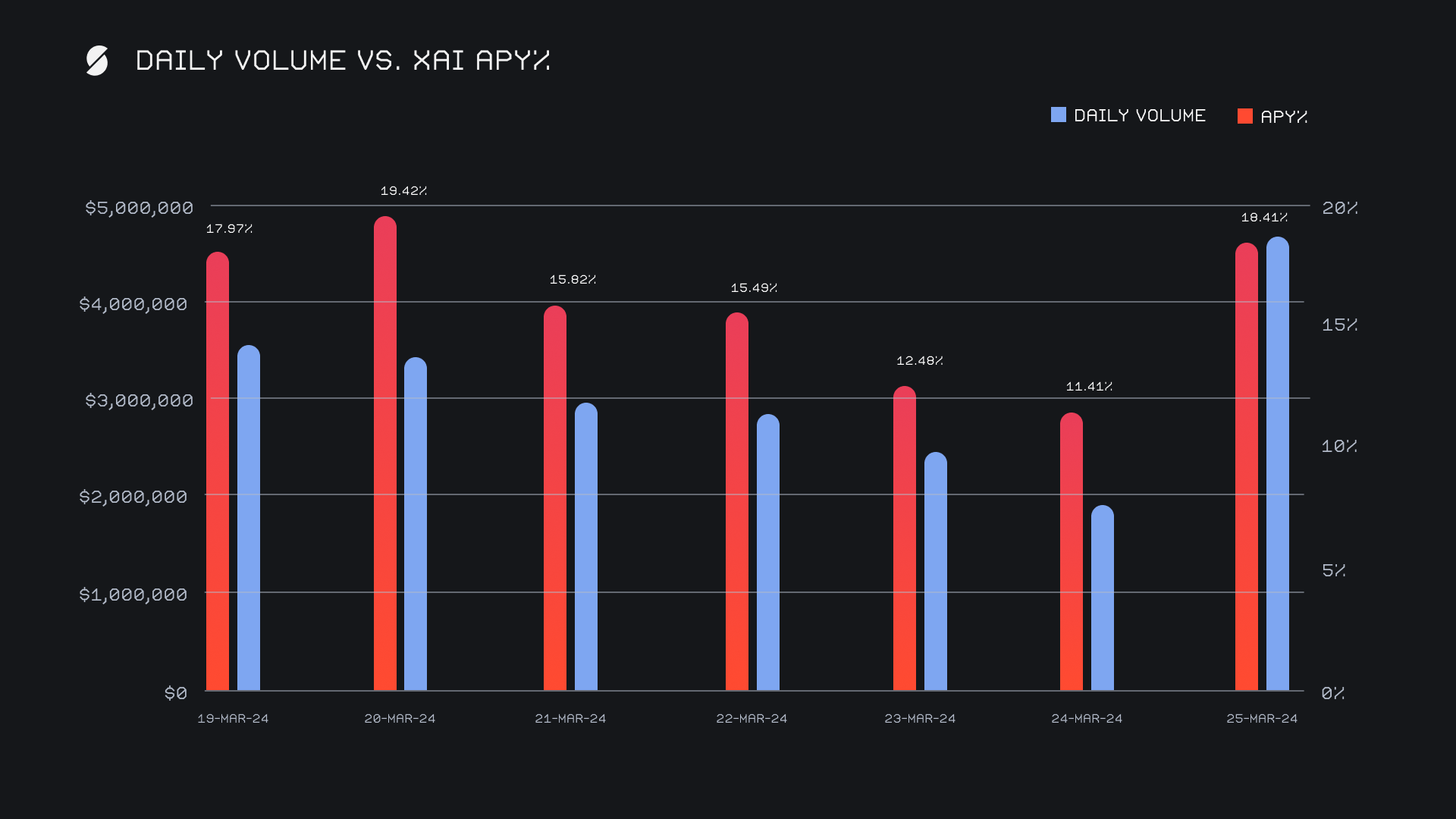 XAI stakers were rewarded with an average APY of 15.86% this week, with a daily rewards high of 57,187.93 XAI (an APY of 19.42%) being distributed to our staking vault on March 21st, 2024. This was following a daily volume of $3.4m. This week XAI stakers received a total of 331,474.62 XAI or $60,394.68 USD in staking rewards.