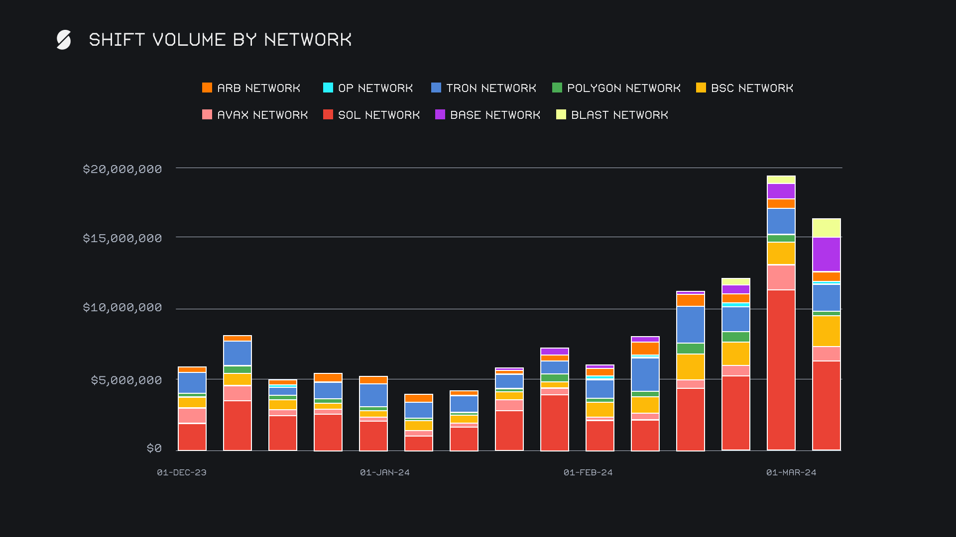 Alternate networks to ETH provide another good example of this distributed volume. All together they summed for an impressive $16.4m, accounting for approximately 38% of our weekly shift volume. Proportionately, this still sits only just behind the Ethereum network, which this week ended up accounting for a slightly larger 40% of shift volume. The Solana network was still the dominant frontrunner among alternate networks to ETH with $6.4m, although it did see a hefty -43.6% decline. Exploding into second place was the Base network with $2.5m (+138%), followed by the Binance Smart Chain (BSC) network with $2.2m (+35.7%). The BSC network has rebounded quite significantly and seen its average weekly volume more than double as compared to last month, a stretch where the network remained quite stagnant. The Tron network carried on as usual with $2.0m (+10.7%), while the Blast network boomed to $1.3m overall in just its third week since listing. Its weekly percentage gain of +140% represented the largest positive change among any alternate network.