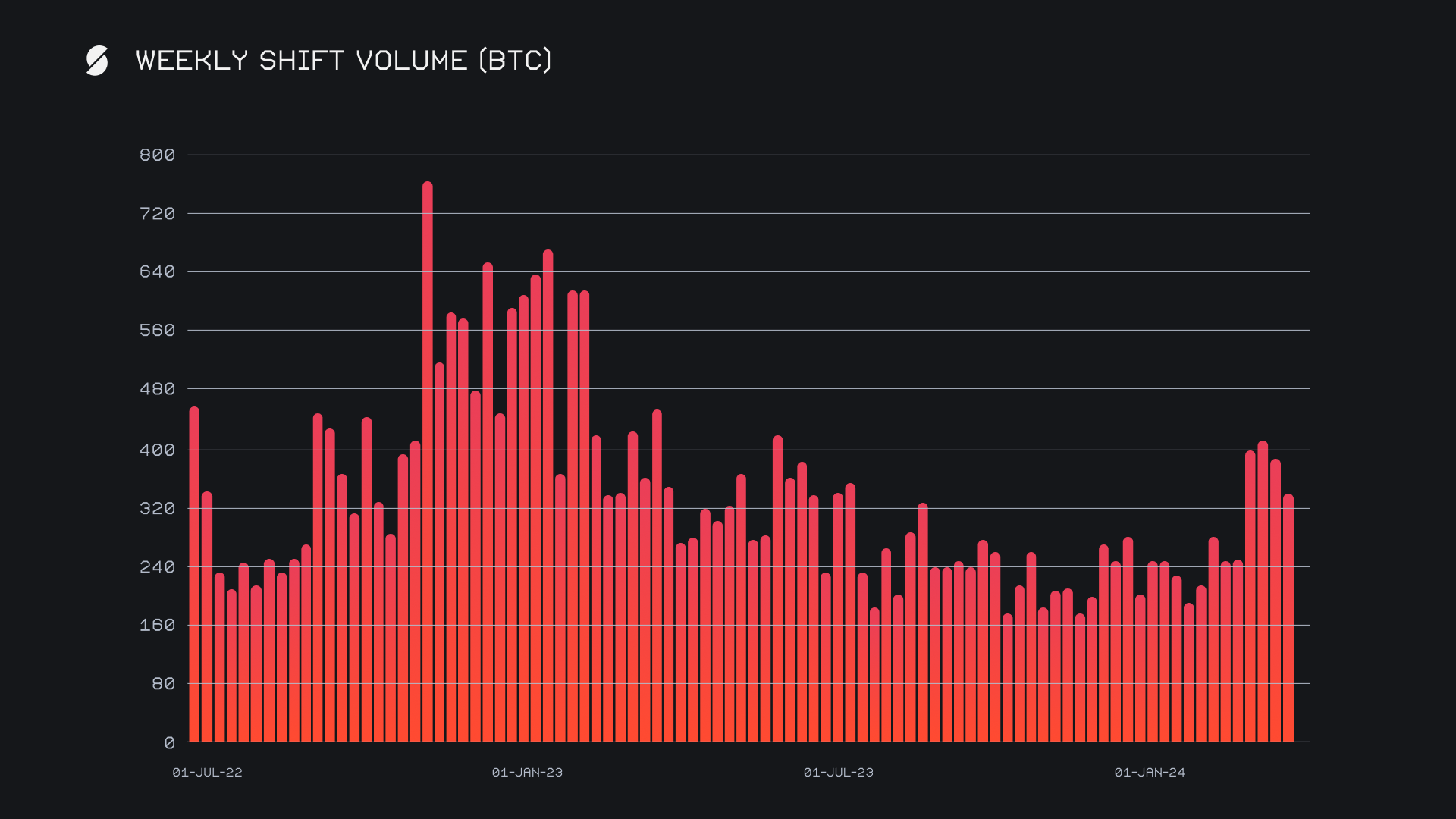 SideShift had another very solid performance, rounding off the period with a gross volume of $21.8m (-18.1%). Following the outstanding previous two weeks that we just had, this week ranked as our third highest overall weekly volume to date. At this current rate, we are on pace to break $100m in monthly volume for March 2024. This week’s volume occurred alongside a shift count which remained extremely strong, and ended with a total shift count of 11,455 (-2.8%). Recall that as mentioned in last week’s report, this sum sits far higher than the average of ~7,000 shifts per week which we have noted over the past couple of years. Together, these figures combined to produce daily averages of $3.1m on 1,636 shifts. When denoted in BTC, our weekly volume amounted to 330.49 (-13.4%).