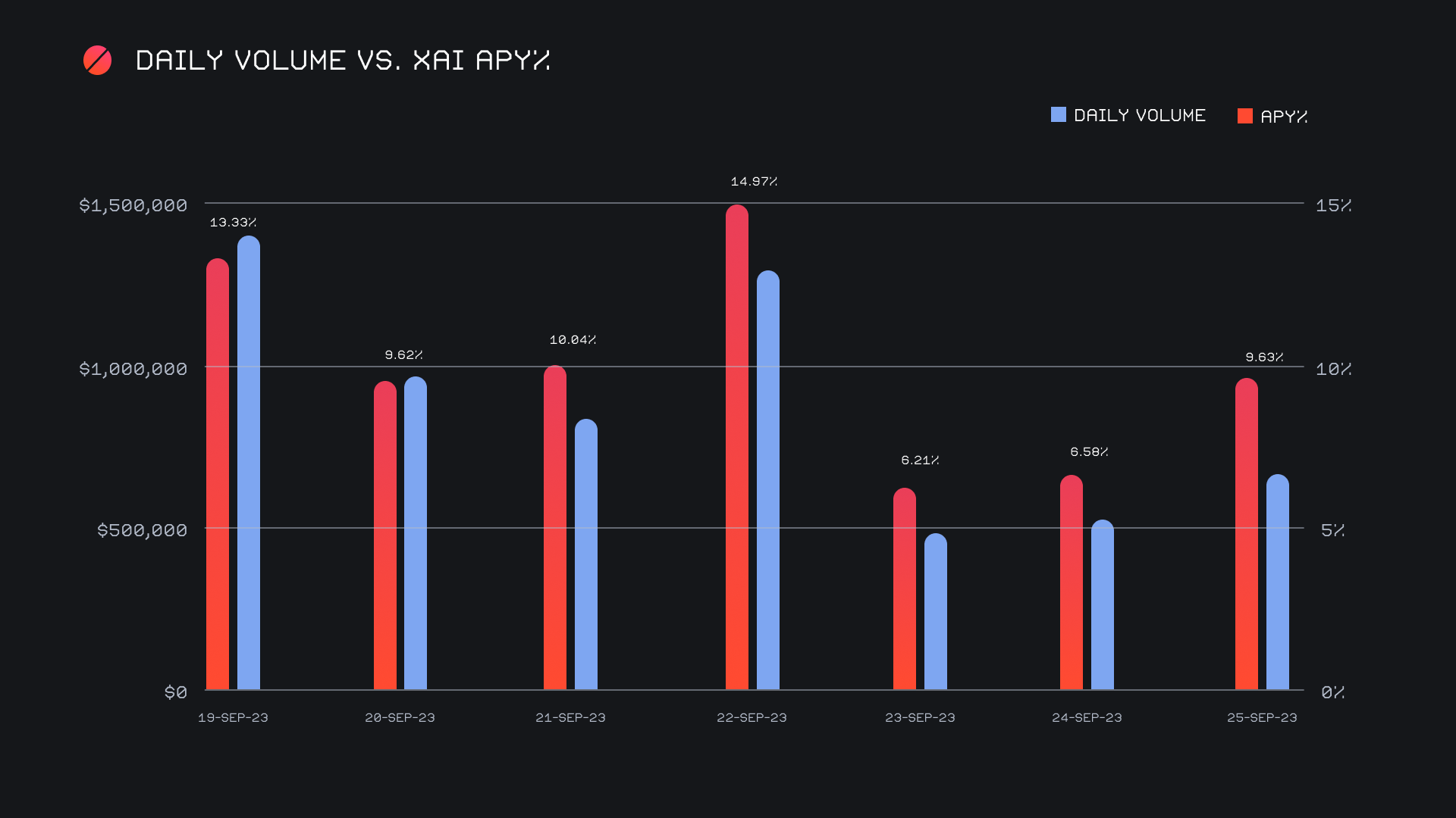 XAI stakers were rewarded with an average APY of 10.13% this week with a daily rewards high of 42,582.74 XAI or $3,286.49 (an APY of 14.97%) being distributed to our staking vault on September 23rd, 2023. This was following a daily volume of $1.3m. This week XAI stakers received a total of 203,847.97 XAI or 15,900.14 USD in staking rewards.