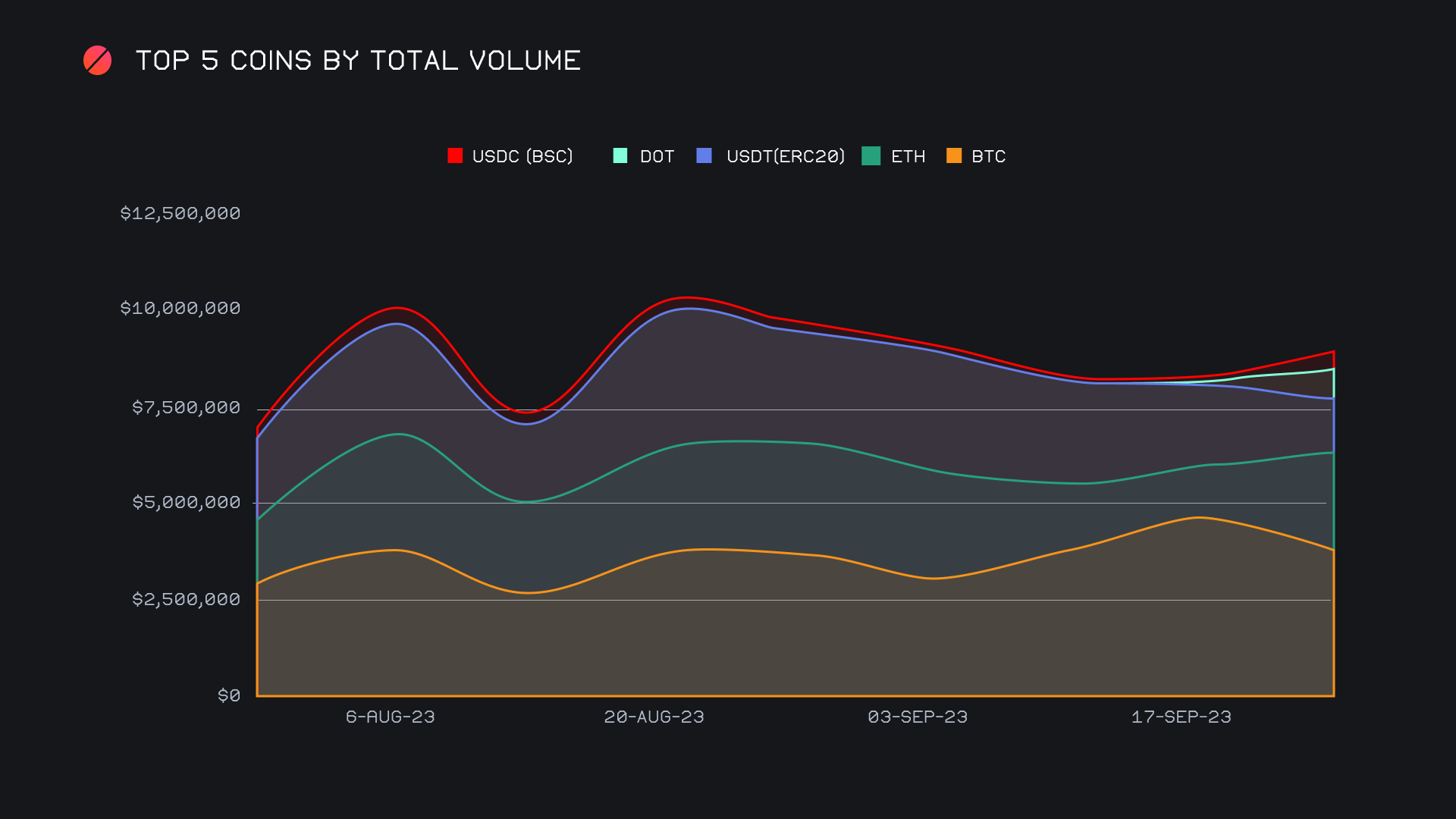 With $1.8m (+43.5%), BTC dominated the top of the settlement chart - the next closest (ETH) failed to even breach $700k. This speaks volumes to the strong demand for BTC at the moment, with SideShift users preferring it to even stablecoins by a hefty margin.