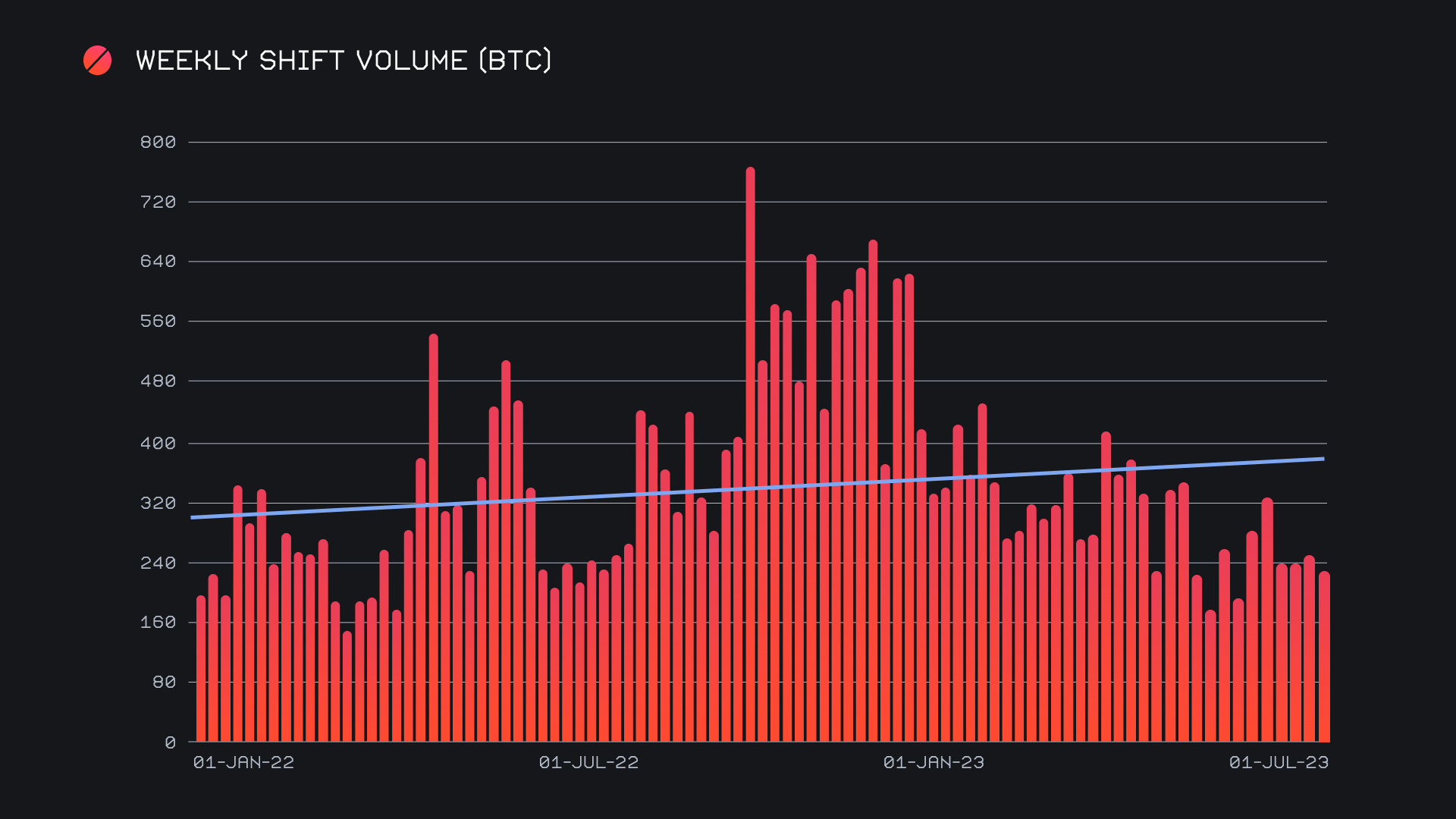 SideShift spent the week with daily volumes averaging around $1m, before slowing to around $500k upon entering the weekend. We ended the period with a gross volume of $6.2m (-2.2%) alongside a shift count of 5,229 (+5%), figures which have not wavered much throughout the month. Whereas last week saw an extremely large portion of volume coming from integrations, this week saw a reversion as most of it occurred directly on SideShift.ai. Together, these figures combined for daily averages of $885k on 747 shifts. When denoted in BTC, our daily volume amounted to 231.69 (-3%).