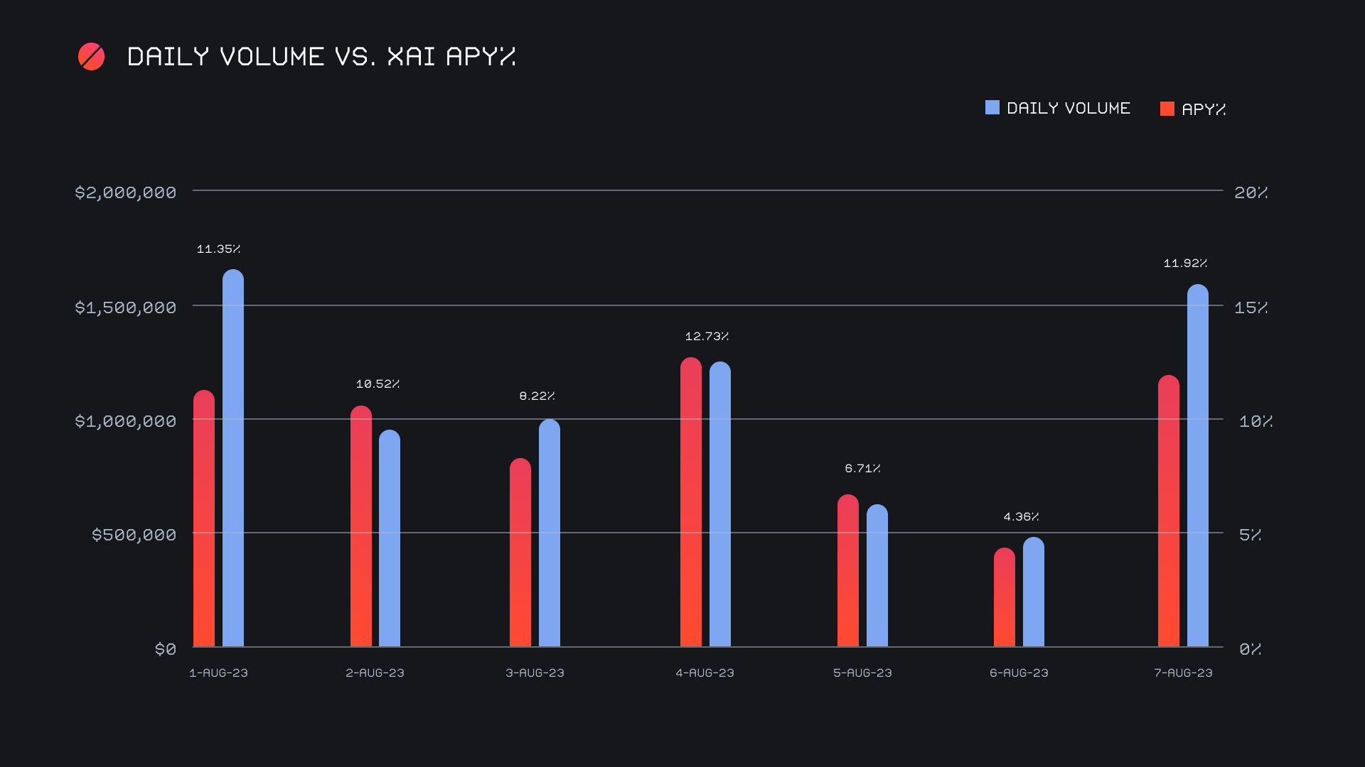 XAI stakers were rewarded with an average APY of 9.08% this week, with a daily rewards high of 36,237.47 XAI (an APY of 12.73%) being distributed to our staking vault on August 4th, 2023. This was following a daily volume of $1.2m. This week XAI stakers received a total of 189,503.18 XAI or $19,997.13 USD in staking rewards.