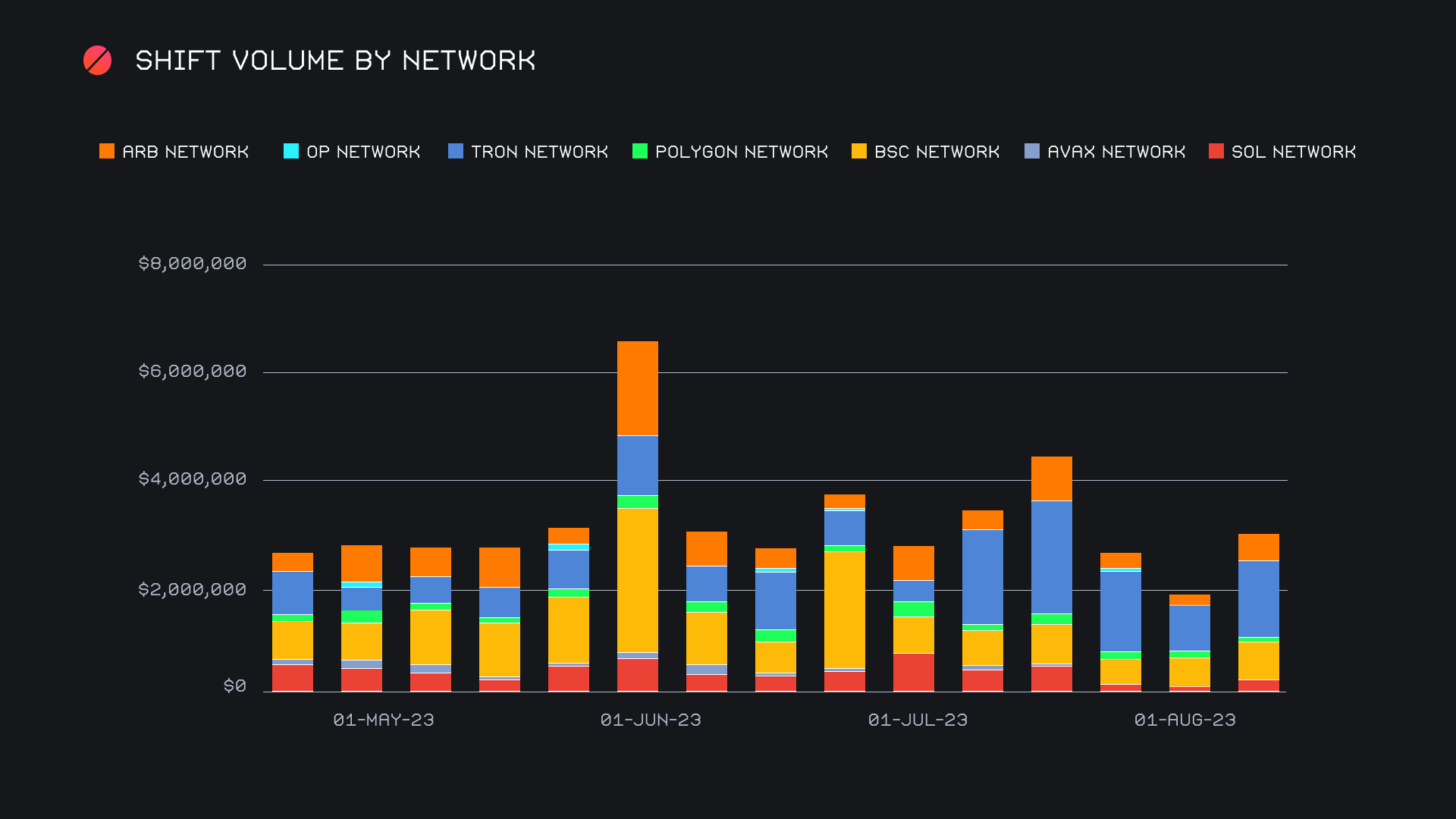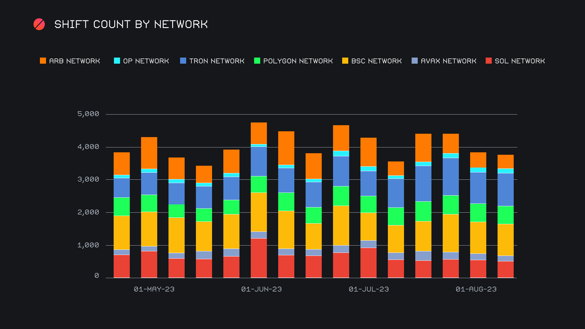Although volume on these alternate networks has been quite varied week to week, it is worth mentioning the relative stability of shift count. In the above chart, you will see the summed volume has quite a wide range, spanning from $2m lows to over $6m highs in the past few months. Shift count meanwhile has fluctuated very minorly and continues to hang around the 4,000 per month mark. This tells us that the use of these networks continues to remain steady, even though volume may look somewhat discouraging at times. Ultimately this is a promising sign.