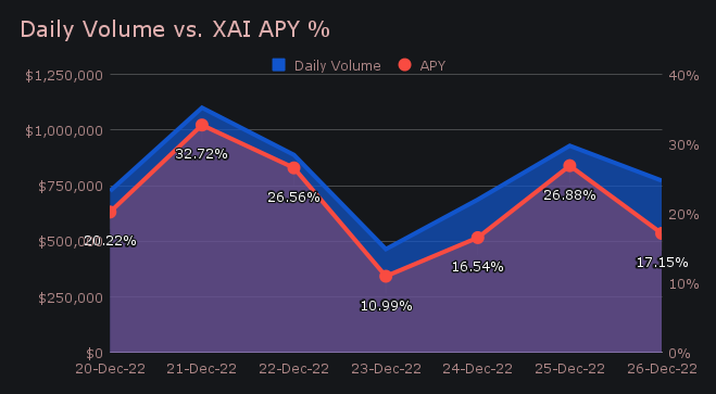 XAI stakers were rewarded with an average APY of 21.58% throughout the week. A daily rewards high of 44,297.69 XAI (yielding a 32.72% daily return) was deposited to our staking vault on December 21st, 2022, following a daily volume of $1.10m.