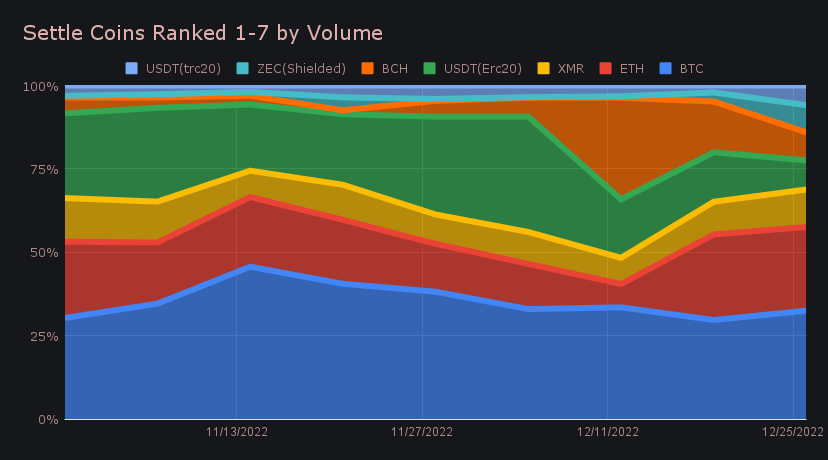 On that note, ZEC was the only coin among our top 6 settle coins to see an increase from last week. BTC retained the top spot for the third consecutive week, with a settle volume of $1.47m (-21.9%). In second place was ETH with $1.63m (-30.2%), while XMR placed third with $510k (-18.2%). Aside from the top 3, volume among settle coins was relatively low, but a few mid level coins seemed to pique the interest of some users. USDT on Tron grew by 102% to net $268k, while AVAX boomed by over 30x to total $199k.