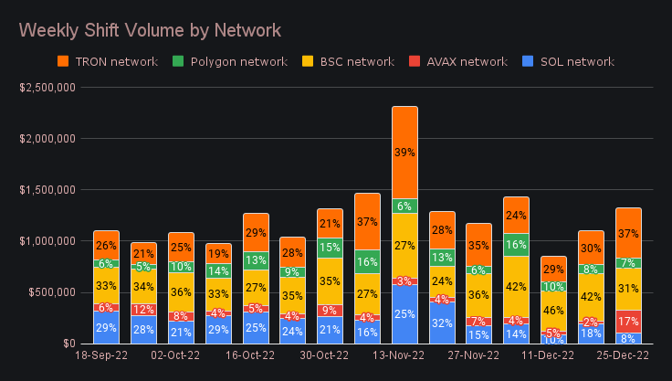 Networks other than ETH are slowly beginning to trend upwards once more, further supporting the notion that users are slowly venturing out into other coins. All together, the Tron, BSC, SOL, AVAX, and Polygon networks combined for $1.32m in volume, a ~20% jump from last week’s sum. In particular, Tron is beginning to pick up steam again, while shifting on BSC has slowed slightly. You can also observe the impact the aforementioned AVAX shifts had on this total. All together, shifts on the Avalanche network combined to account for 17% of the total this week, a figure far larger than seen in past months.